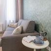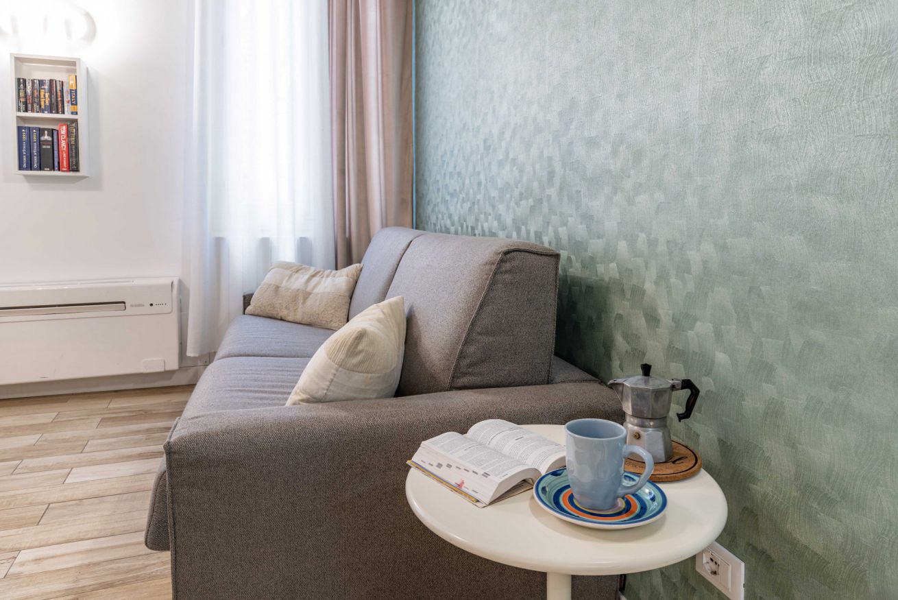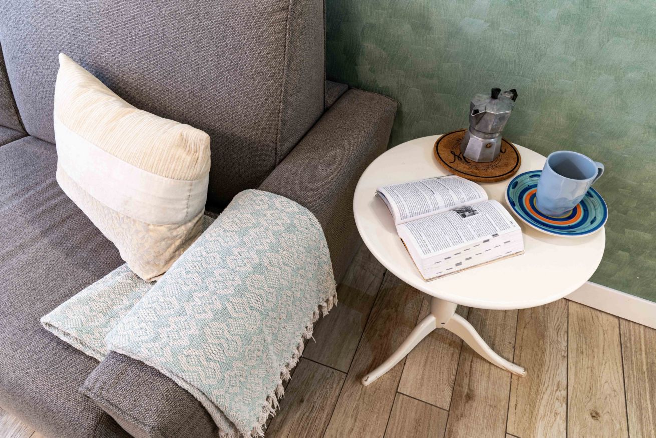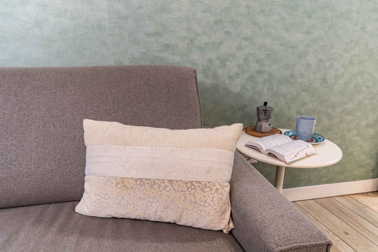 La zona giorno accoglie un soggiorno con cucina a vista, funzionale e ben organizzato, impreziosito da un divano letto di alta qualità, particolarmente confortevole. Anche questo ambiente è dotato di aria condizionata, garantendo il massimo comfort in ogni stagione.