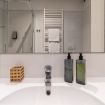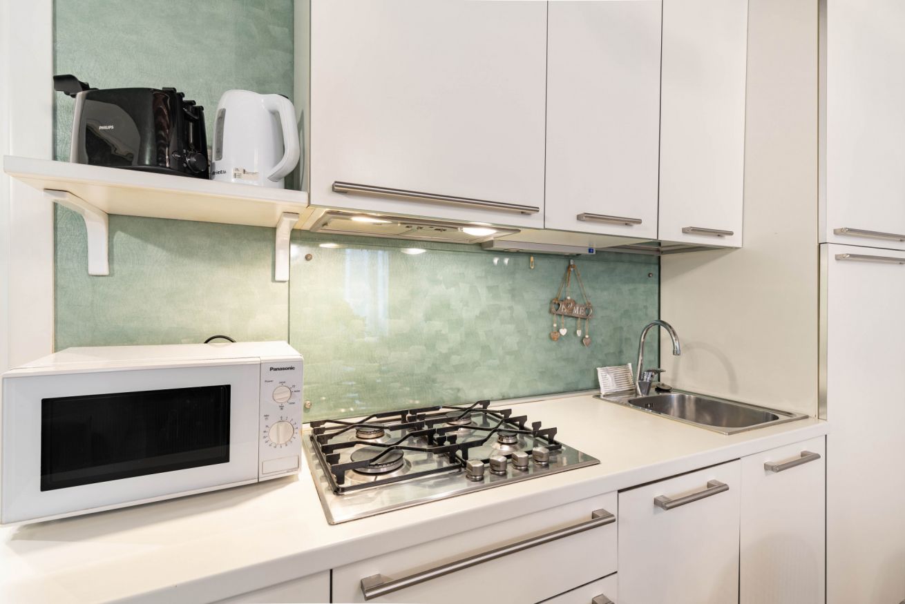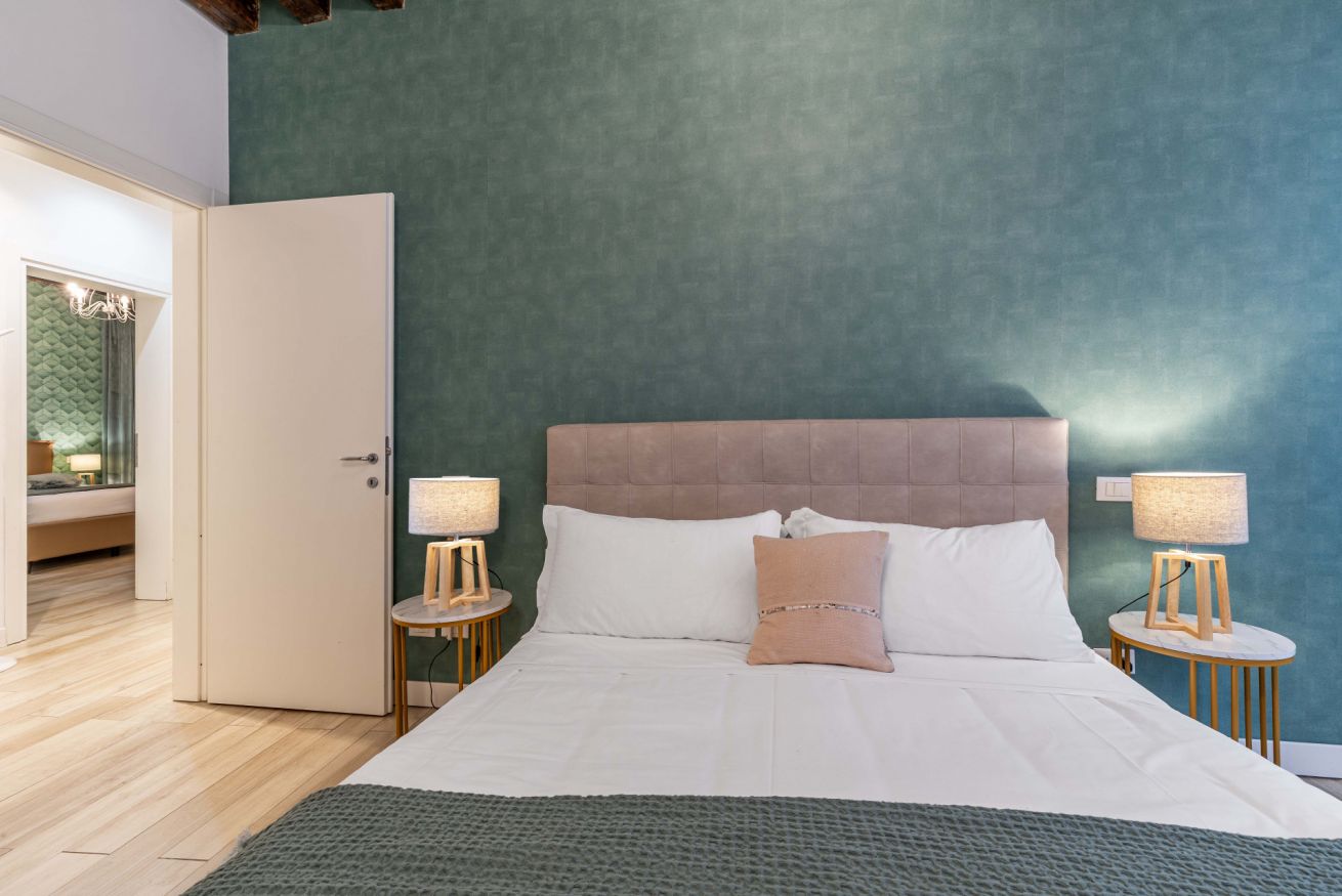 L’appartamento si distingue per un design accattivante e curato, caratterizzato da raffinate nuance di verde smeraldo che trasmettono una piacevole sensazione di serenità, equilibrio e benessere, rendendo la casa un vero rifugio nel cuore di Venezia.