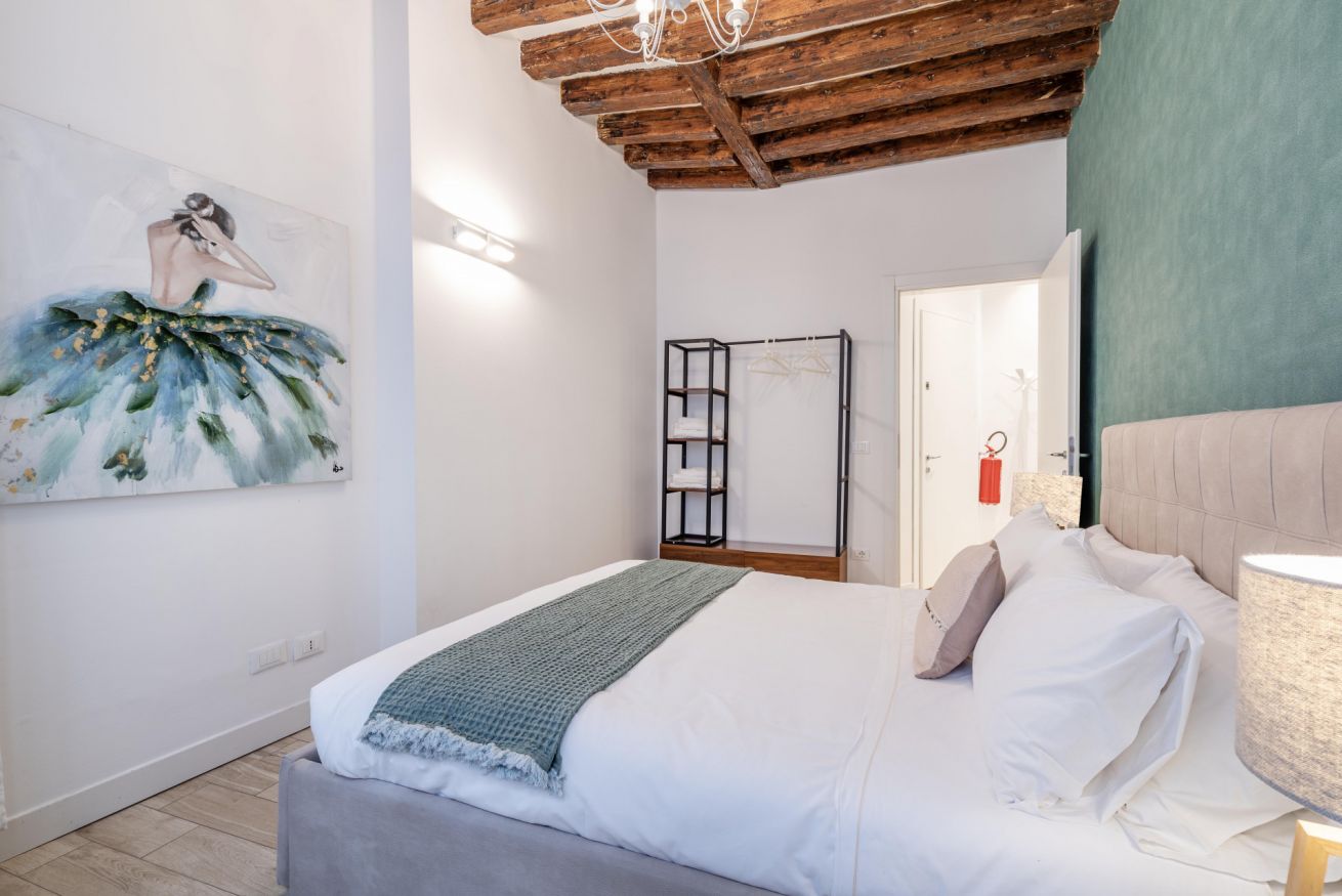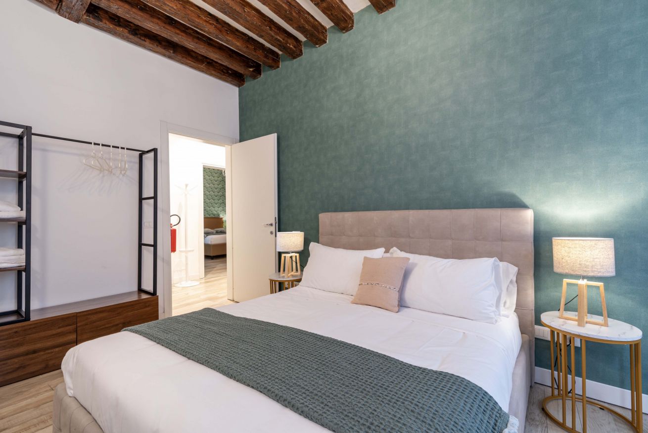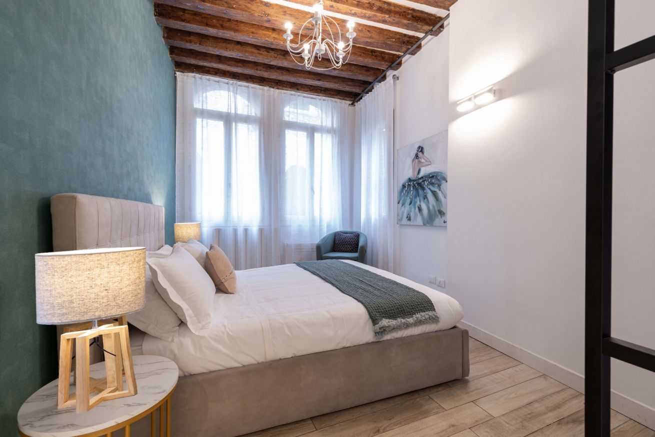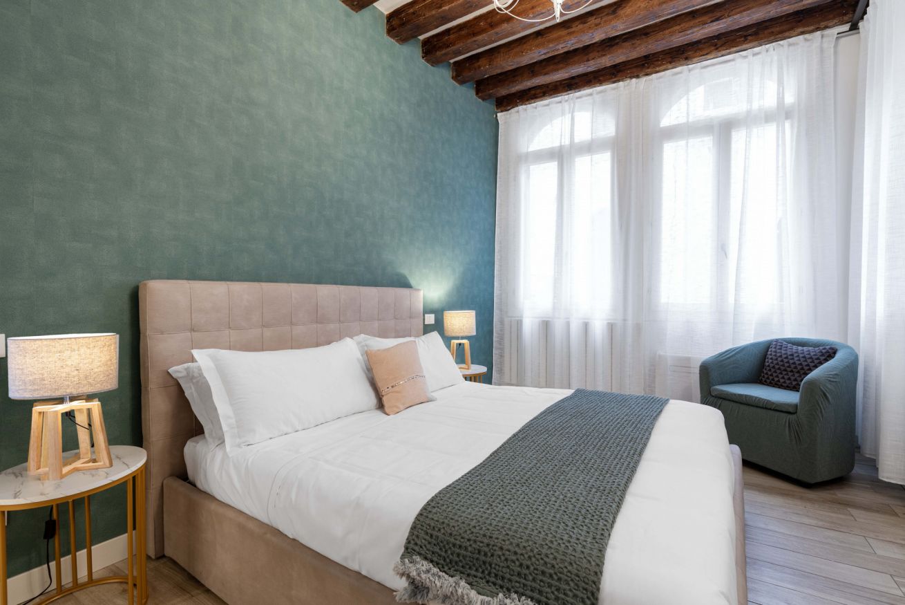 Situato al primo piano di un palazzo veneziano, l’appartamento colpisce per i suoi ambienti ampi, luminosi e armoniosamente distribuiti. La zona notte è composta da due camere da letto molto spaziose, caratterizzate da soffitti alti con travi a vista che donano fascino e ariosità agli spazi. Entrambe le camere sono estremamente luminose, finemente arredate e dotate di aria condizionata; una di esse dispone di bagno en suite, mentre un secondo bagno completo è a disposizione dell’intero appartamento.