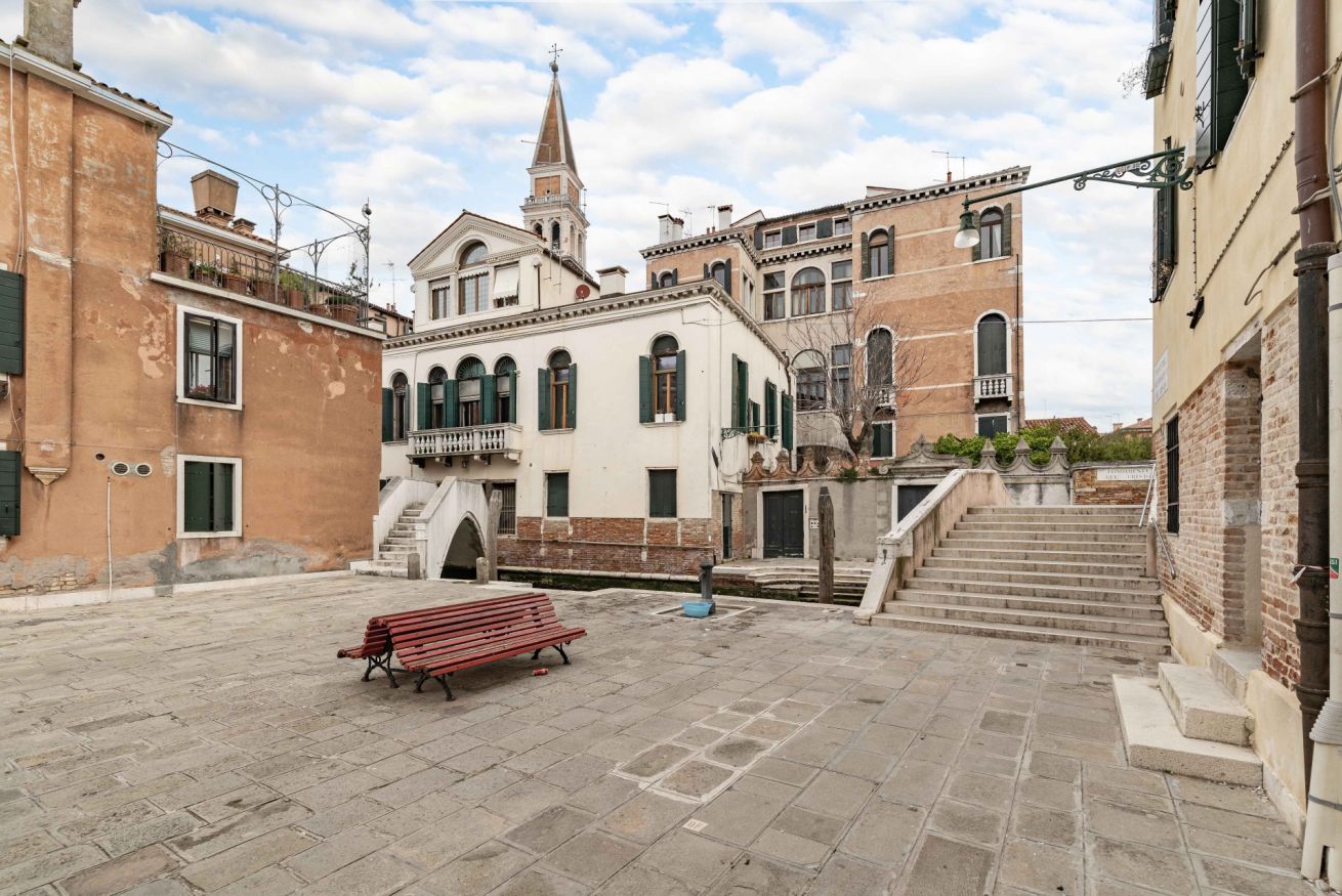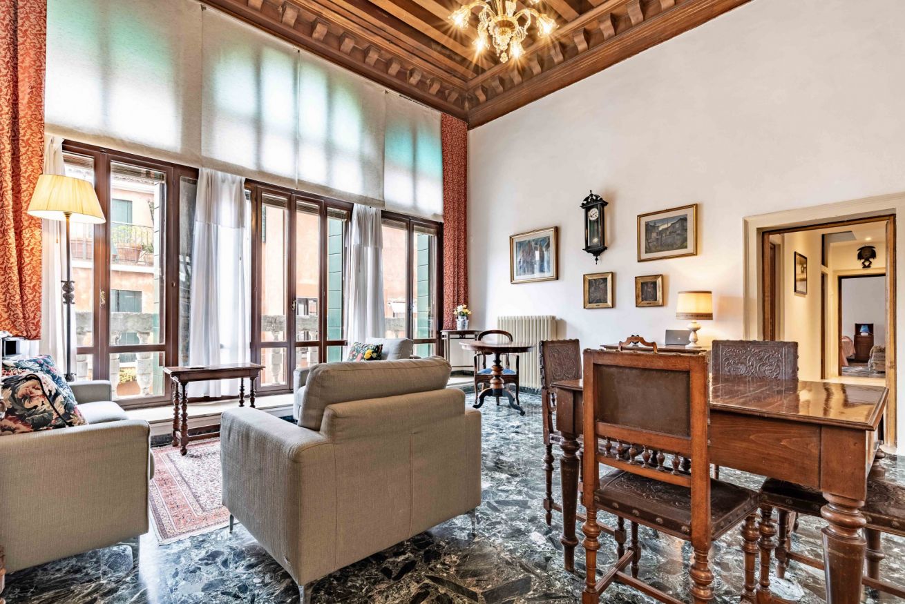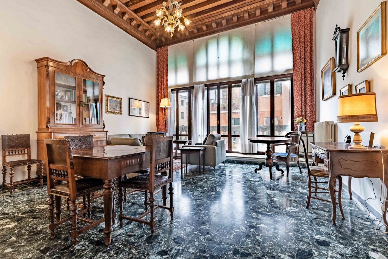 L’appartamento si trova al primo piano di un affascinante palazzo storico con accesso da un suggestivo ponte privato. Fin dal primo ingresso si respira il fascino della Venezia più autentica: soffitti molto alti con travi in legno a vista, arredi e dettagli che raccontano la storia e la tradizione veneziana della famiglia a cui appartiene questa residenza .