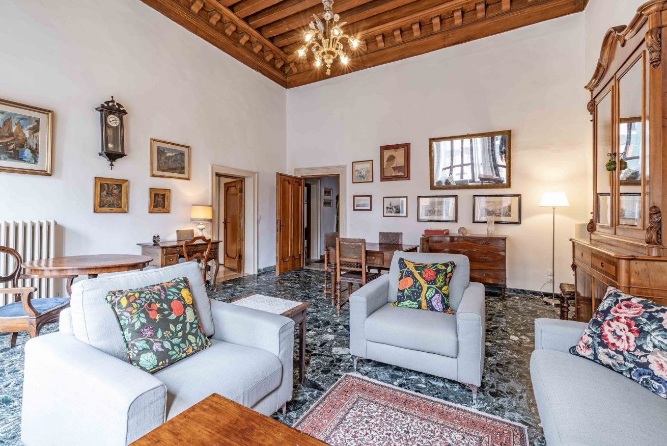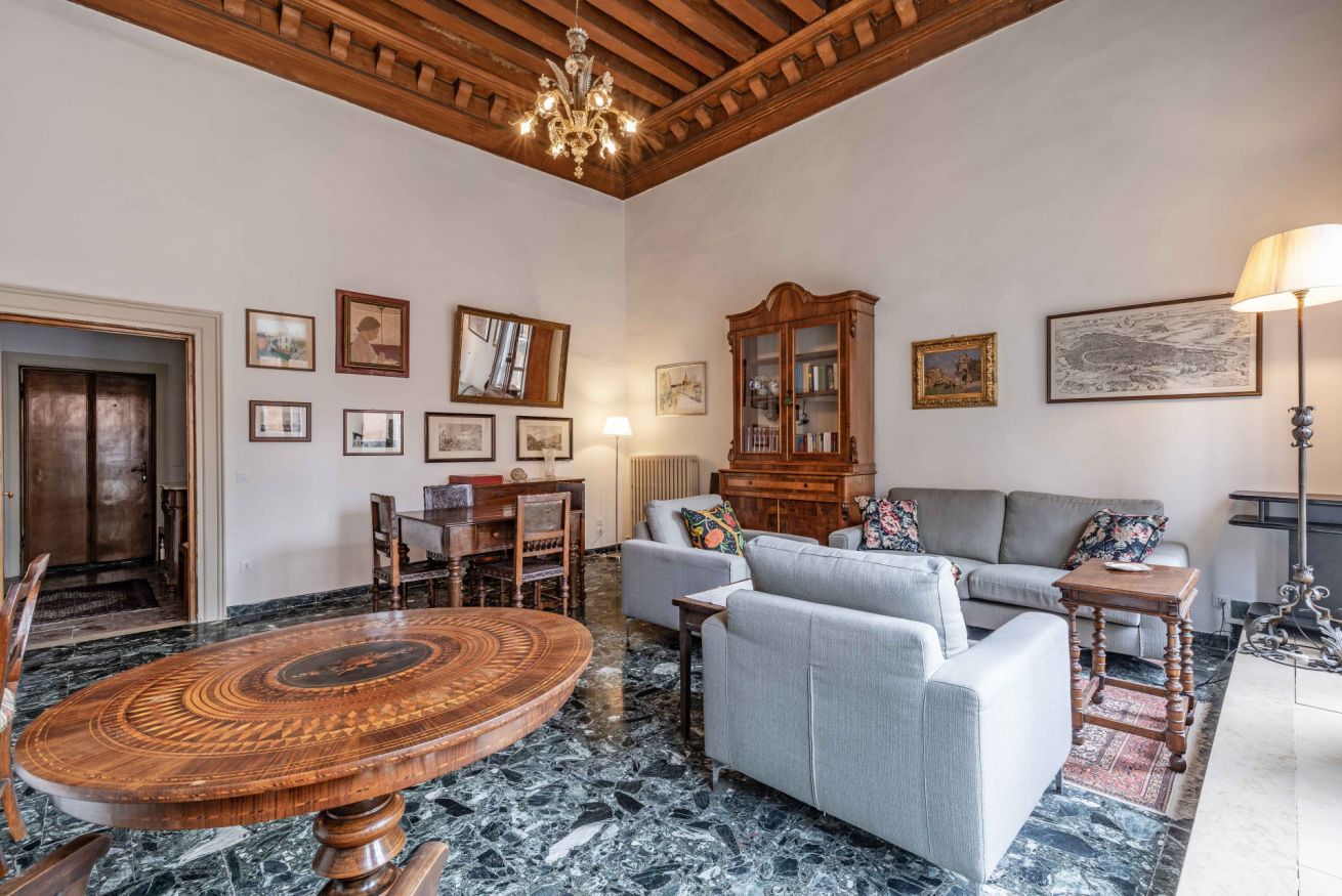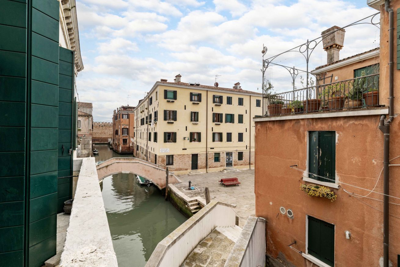 L’appartamento si trova al primo piano di un affascinante palazzo storico con accesso da un suggestivo ponte privato. Fin dal primo ingresso si respira il fascino della Venezia più autentica: soffitti molto alti con travi in legno a vista, arredi e dettagli che raccontano la storia e la tradizione veneziana della famiglia a cui appartiene questa residenza .